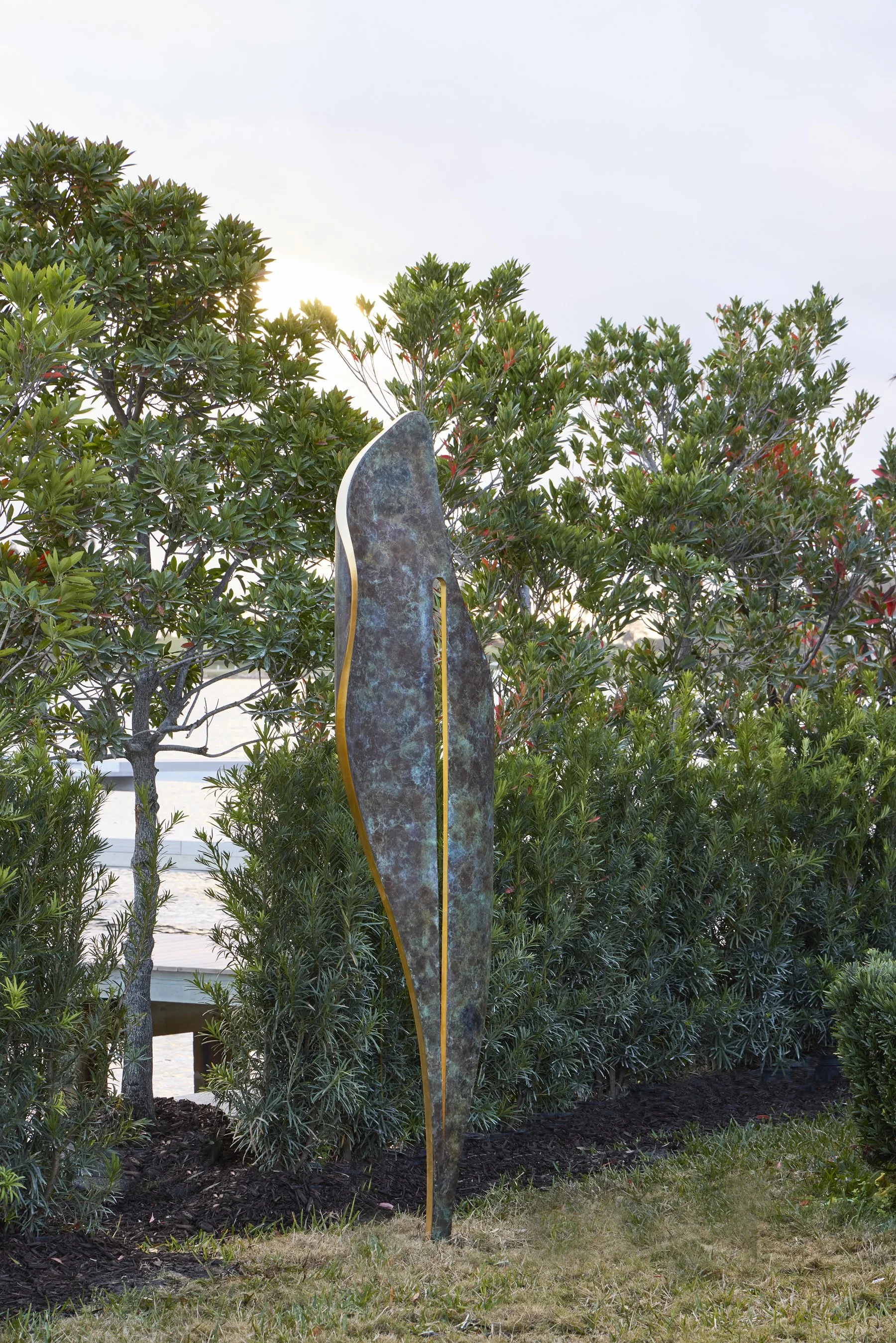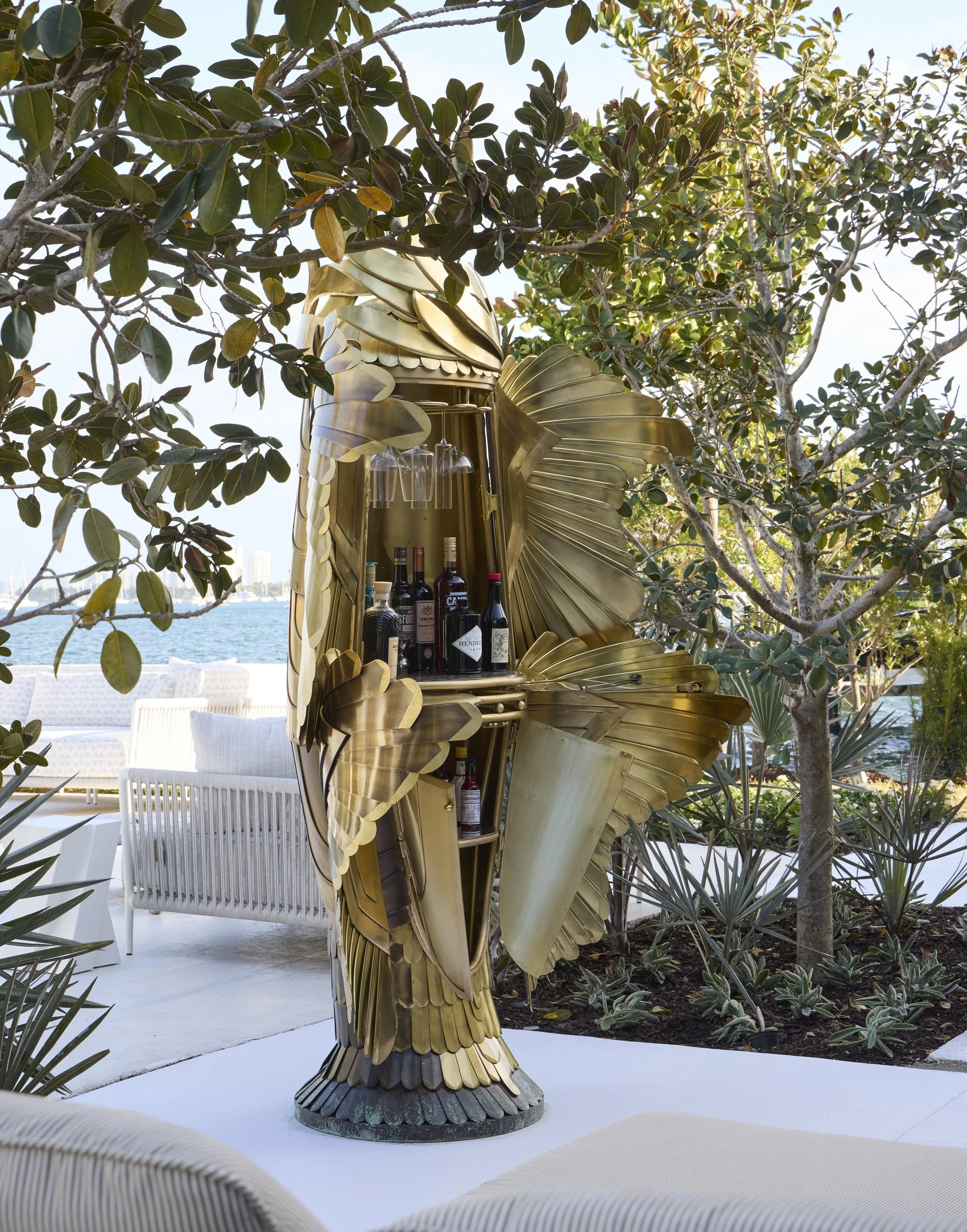 Paradiso – Metals dominate in the bronze and steel of the Cocktail Garden from furnishings to plantings. The central Seraphim Bar by Belt Metal takes inspiration from Les Lalannes with complementary contemporary steel Atelier Artizan lounge furnishings. The monumental “FLO” by David Harber contains the axial view to the water with a bronze keyhole into the sublime.