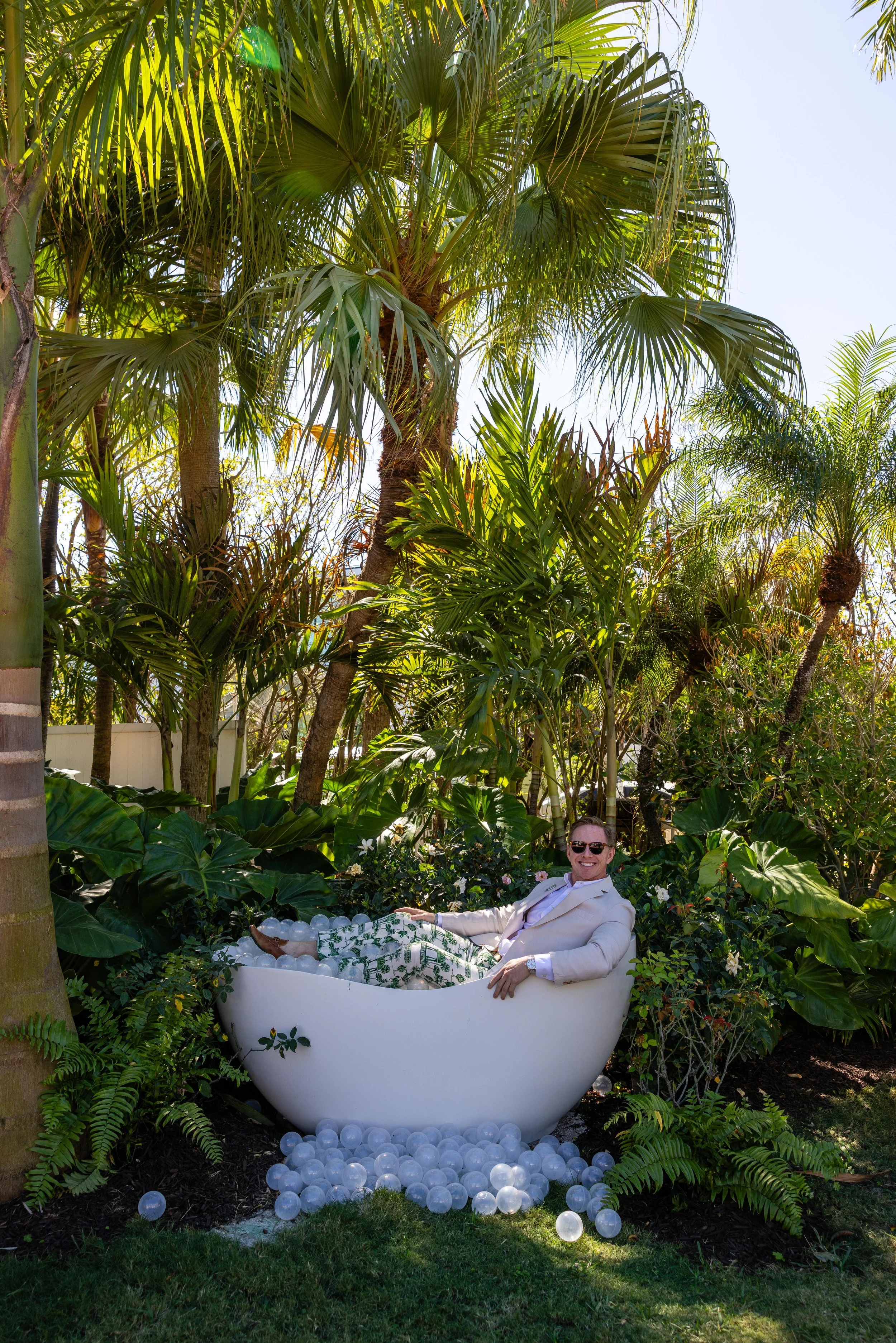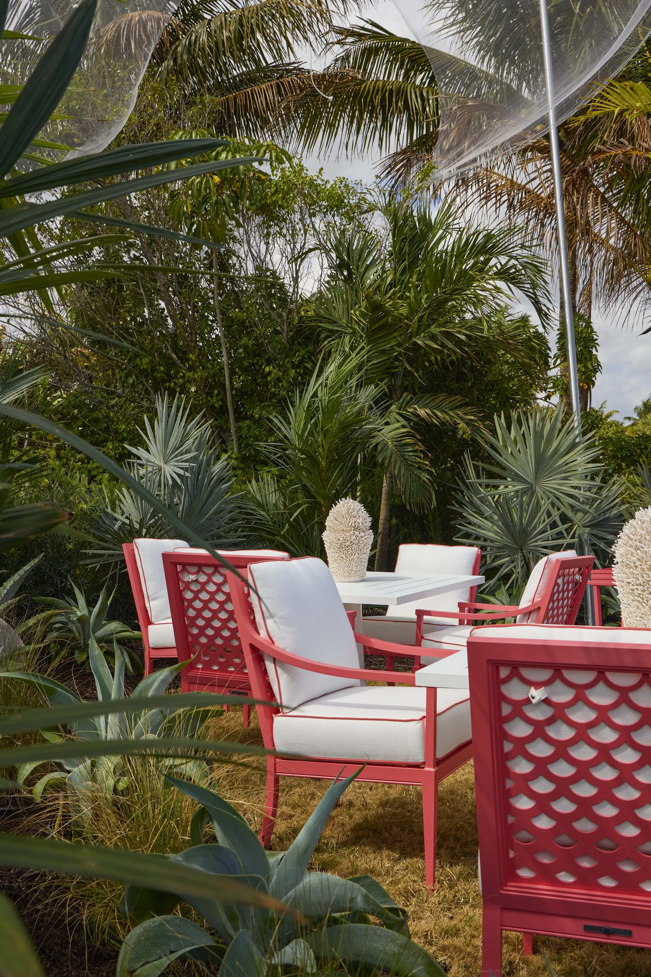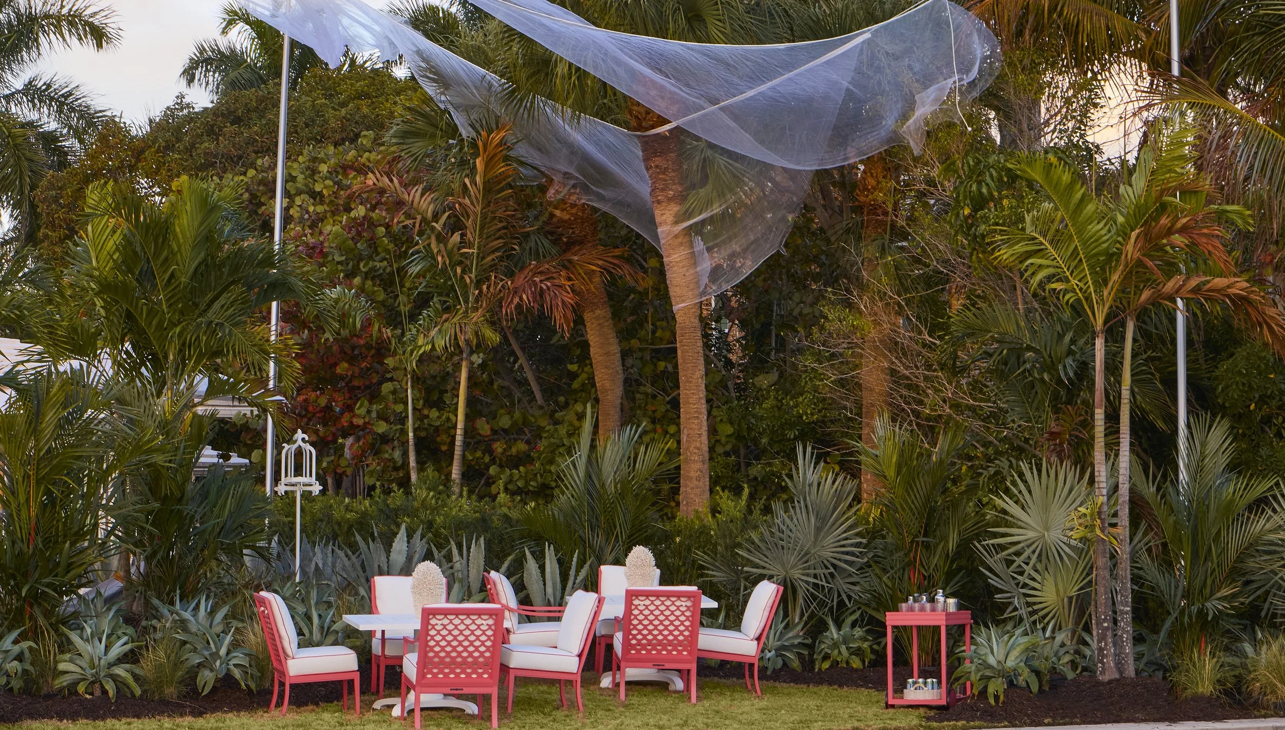 Voliera – A floating sculptural cloud skims the Aviary Garden. A custom bird bath and ombre-scaled back chairs welcome all of God’s winged and finned creatures. Coral lipstick palms and silver Bromeliads anchor the diaphanous space.